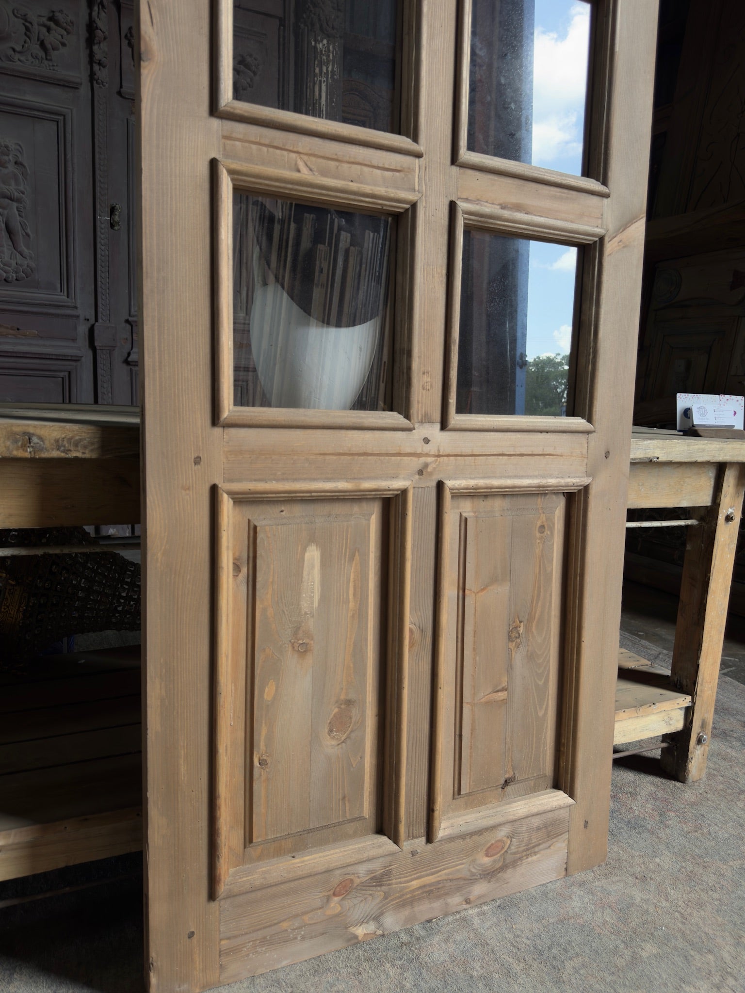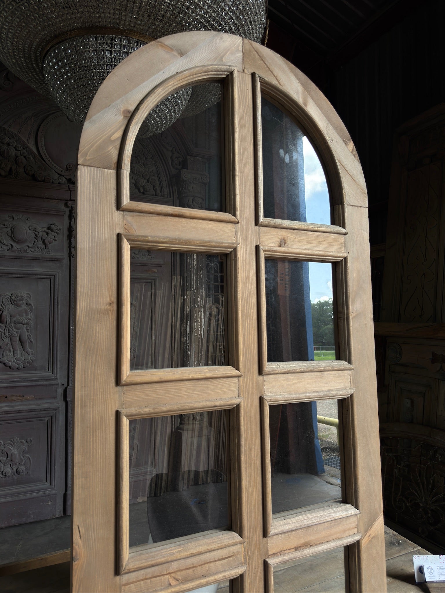 Our doors are sold as pictured and will require professional installation, as well as possible adjustments to fit your space. Glass may need to be sourced and installed separately. Additional photos are available upon request.