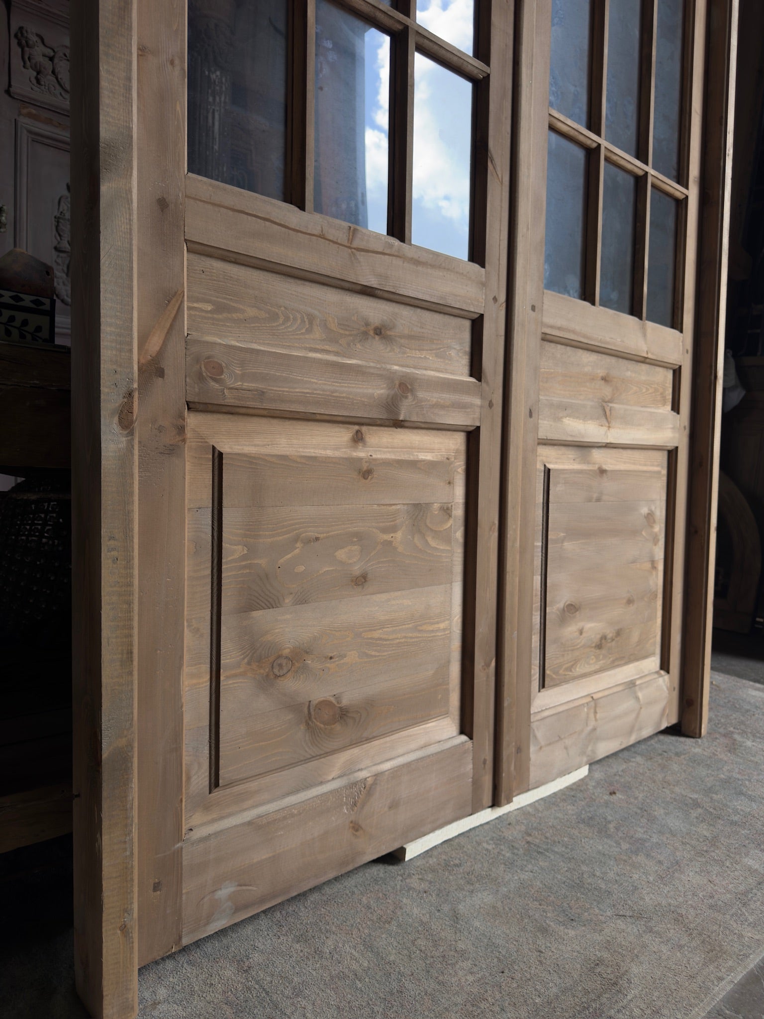 Our doors are sold as pictured and will require professional installation, as well as possible adjustments to fit your space. Glass may need to be sourced and installed separately. Additional photos are available upon request.