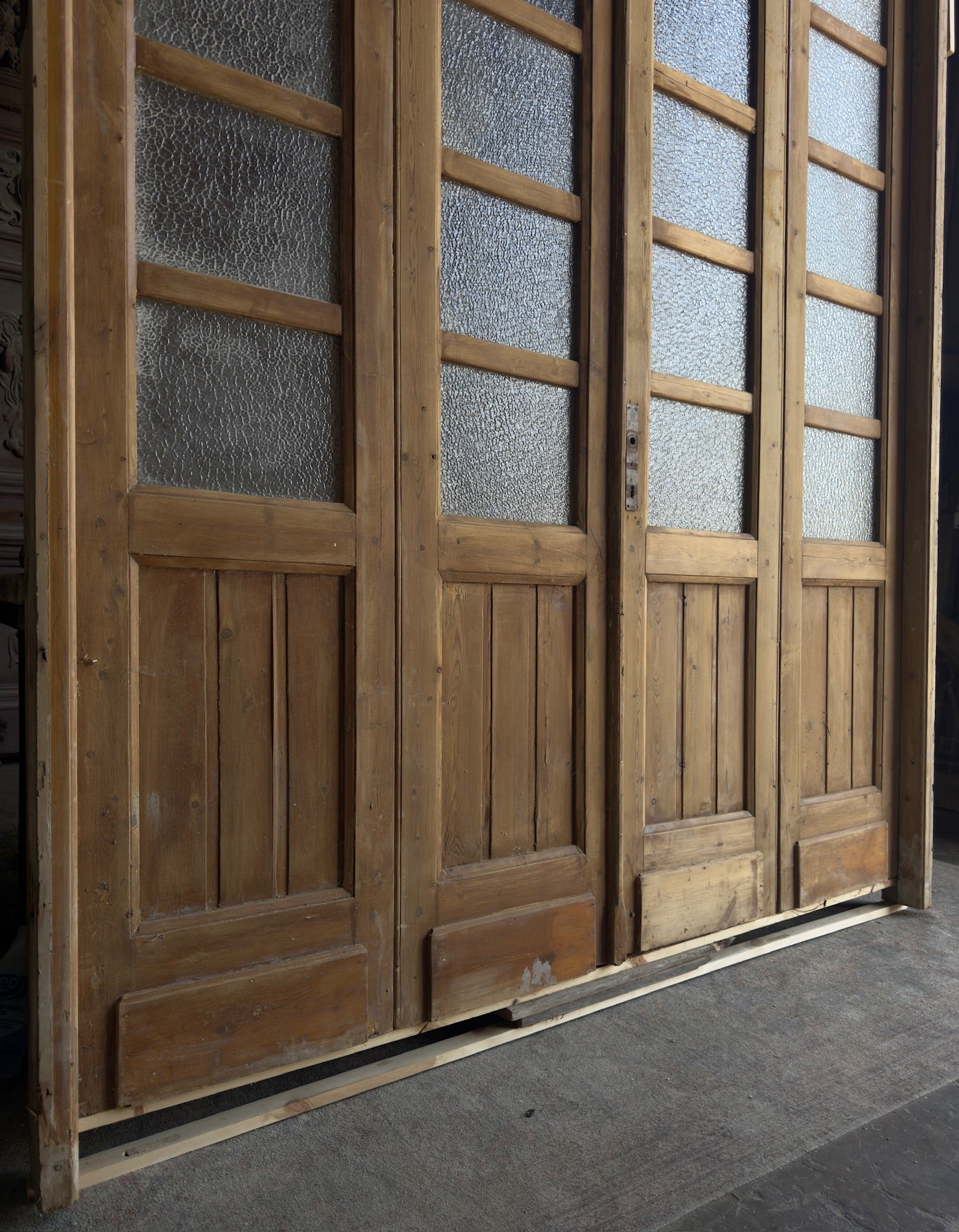 Our doors are sold as-is and will require professional installation, as well as possible adjustments to fit your space. Glass may need replacement or reinforcement. Additional photos are available upon request.